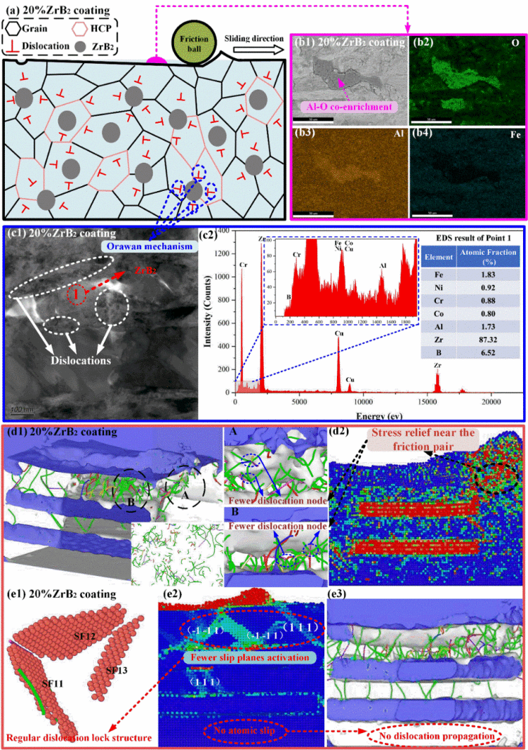 应用于大型装备构件表面的高熵合金涂层易发生磨损。因此,增强其摩擦学性能是当务之急。本研究通过ZrB2颗粒调控高熵合金涂层的摩擦学性能。首先,采用激光熔覆技术制备FeNiCrCoAl0.5-X ZrB2 ( X = 0 , 10 , 20 , 30 wt.%)涂层。随后,通过实验研究了涂层的微观结构和摩擦学性能,以确定最佳ZrB2含量。分子动力学模拟被用于探究ZrB2对涂层摩擦学性能的影响。实验结果表明,20 wt.% ZrB2涂层具有最佳的摩擦学性能,摩擦系数为0.33,磨损量为1.11 mg。适量ZrB2减轻了涂层表面的粘着磨损,使粘着磨损区出现Al-O共富集。此外,含ZrB2涂层中的位错绕过陶瓷颗粒,阻碍了位错的扩展和运动。分子动力学纳米磨损模拟表明,适量的ZrB2含量降低了摩擦副附近的应力集中,并抑制了磨损过程中滑移面的激活。这两种作用协同提高了涂层的摩擦学性能。具体而言,适量的ZrB2含量缓解了摩擦副附近的应力集中,从而阻碍了位错形核,阻止了位错节点的形成。适量的ZrB2含量也抑制了涂层内部滑移面的激活,涂层内部只能形成单一的位错锁结构。本研究结果航空航天、能源装备、汽车制造和海洋工程等领域的关键摩擦副表面摩擦学性能的提升以及高性能陶瓷增强高熵合金涂层的制备提供理论和实践依据。