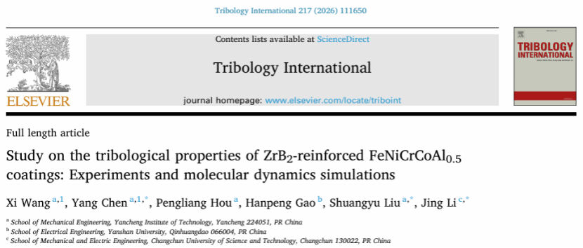 Wang X, Chen Y, Hou P, Gao H, Liu S*, Li J. Study on the tribological properties of ZrB2-reinforced FeNiCrCoAl0.5 coatings: Experiments and molecular dynamics simulations. Tribology International 2026;217:111650. https://doi.org/10.1016/j.triboint.2025.111650